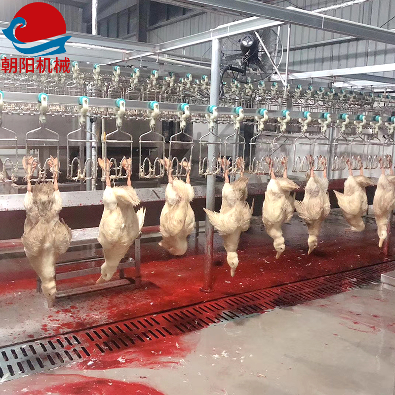 1)肉雞宰殺高架輸送線主要完成的工序:毛雞上掛、水浴式麻電、刺殺、瀝血、燙毛、脫毛、切爪、轉(zhuǎn)掛等。