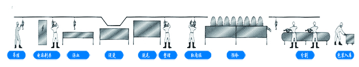 從工藝流程上來(lái)分,鵝的屠宰工藝包括:吊掛、致昏、放血、燙毛、打毛、三次浸臘、拔鵝舌、拔小毛、驗(yàn)毛、掏膛、切爪、內(nèi)外清洗工作、預(yù)冷等步驟。
